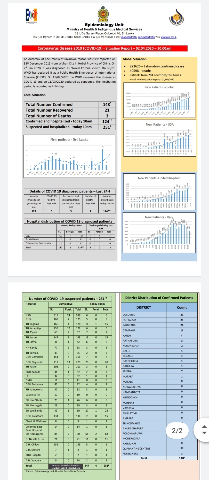 Sri Lanka Coronavirus situation update from Epidemiology Unit of Ministry of Health as at 10am, 2nd of April