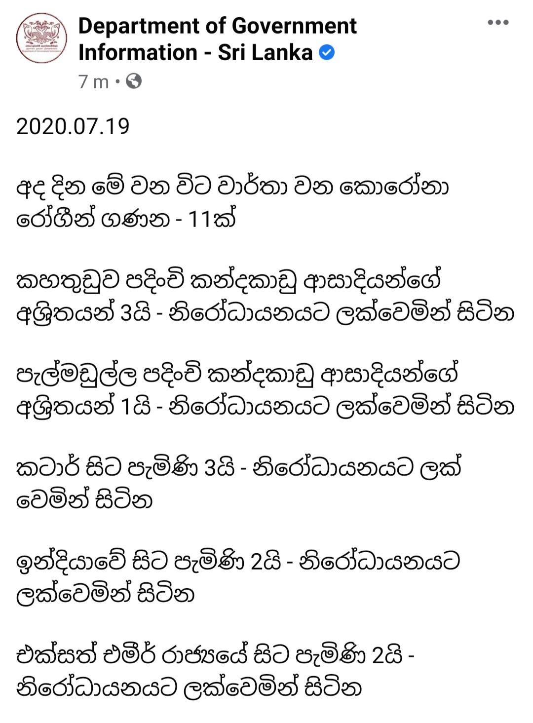 11 new COVID-19 patients identified in Sri Lanka today, increasing the total patients to 2,715.