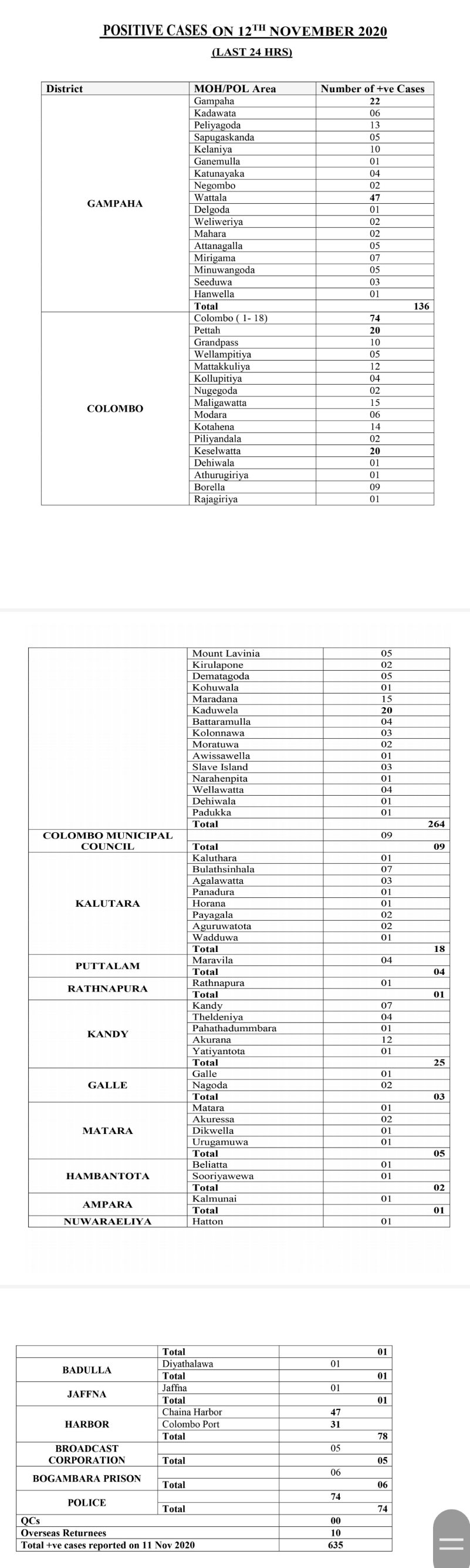 A total of 635 coronavirus patients were reported in Sri Lanka yesterday, with the majority being detected from the Colombo district.